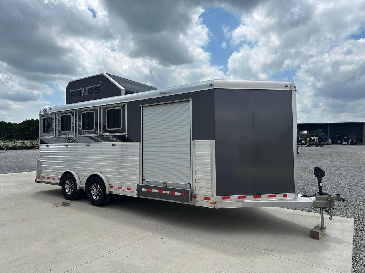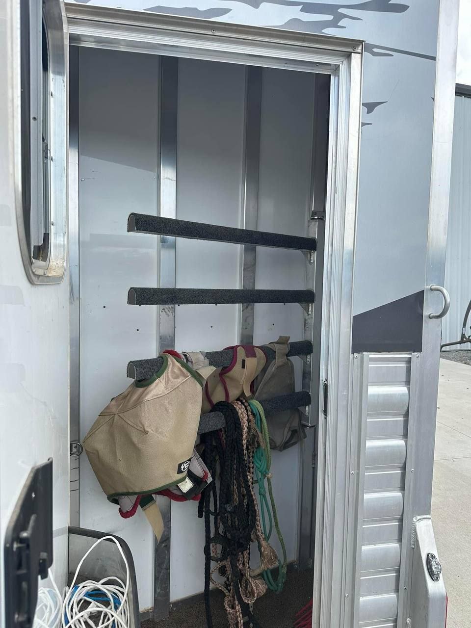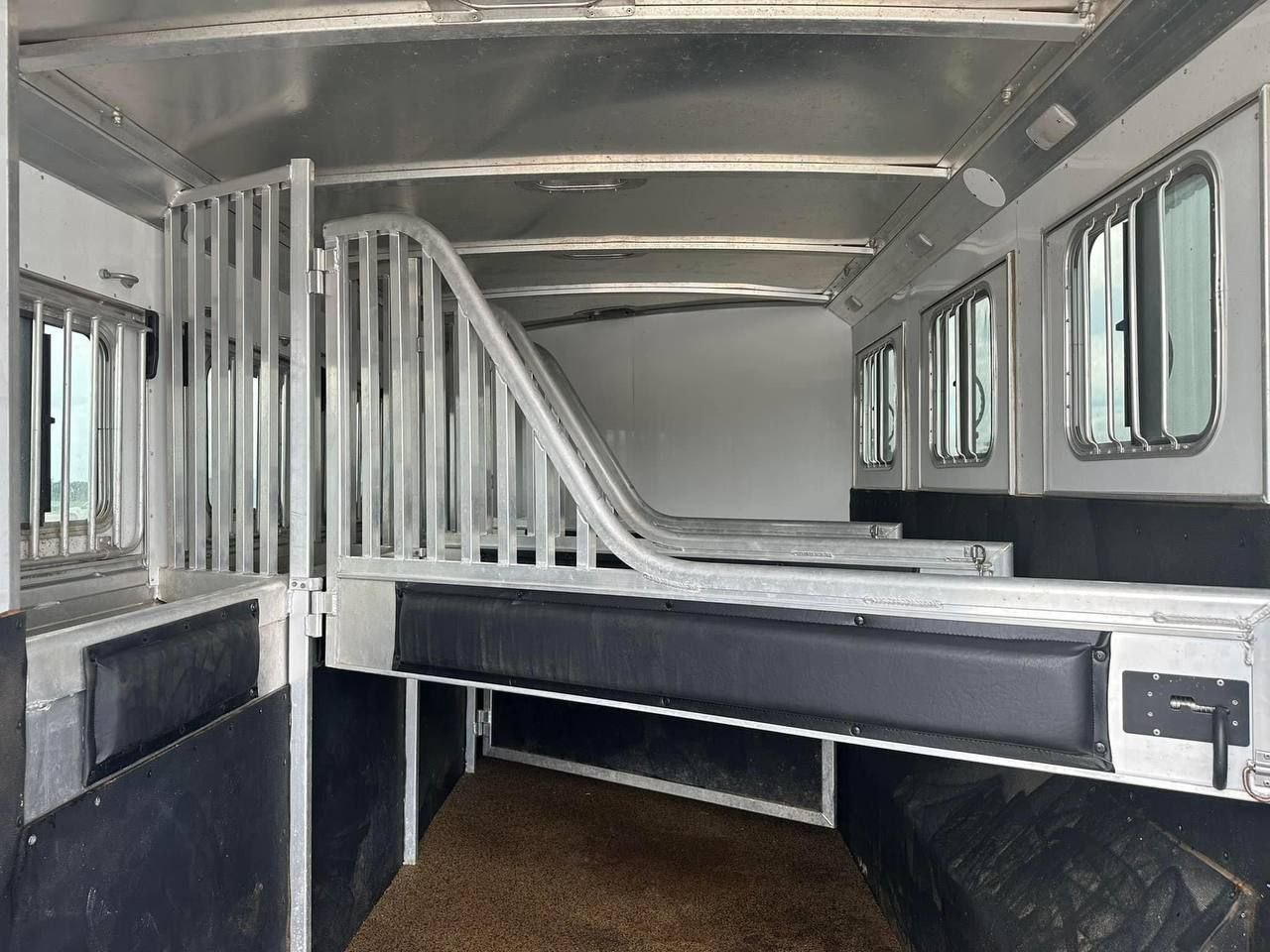 The slant-load configuration ensures horses travel at a natural angle, reducing stress during transport. Inside, the trailer features rubber-lined walls, padded dividers, and treated aluminum flooring with mats, offering secure footing and comfort. Ventilation windows and roof vents promote airflow, while LED lighting enhances visibility.